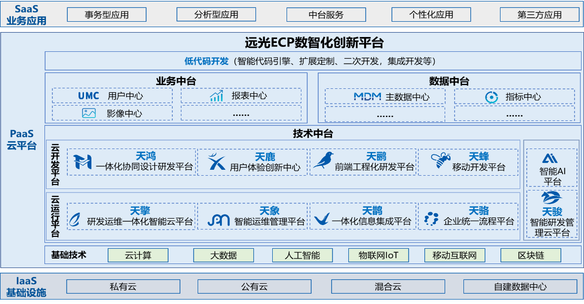 针对需要研发完整产品的用户,可以建设融合了AI能力的远光九天智能一体化云平台,从需求、规划、设计、项目、开发到集成运维的产品全生命周期管理